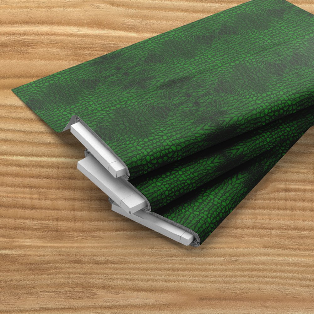 Alligator leather is green and black, shiny, textured skin. It will be a faux finish but will have that scaly skin look. *Please note that the fabric will have a white border around the entire yardage that is selected with a seamless pattern in between.