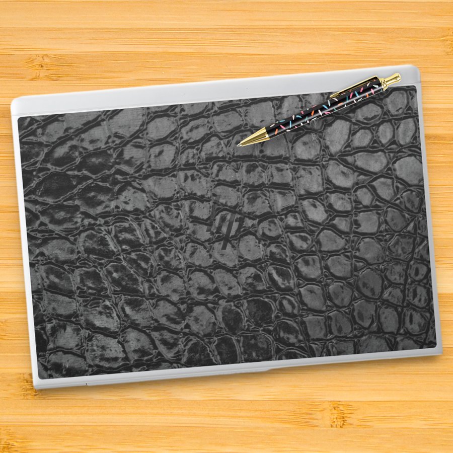 Alligator leather is black with a shiny silvery texture, and is reptile looking skin. It will be a faux finish but will have that scaly skin look.Alligator Black Faux Leather HP Laptop Skin
