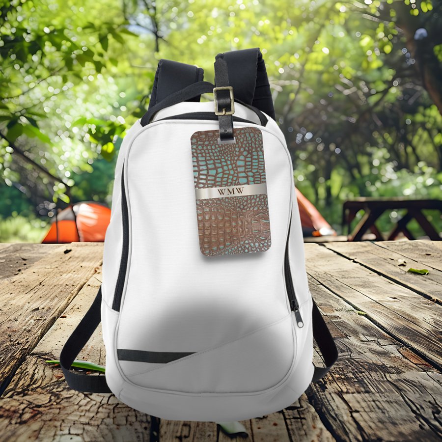 Faux teal, brown, turquoise reptile leather background with faux titanium metallic label. Monogram initials and templates created for you on front and back.Teal Brown Digital Leather Titanium Metal Monogram Luggage Tag